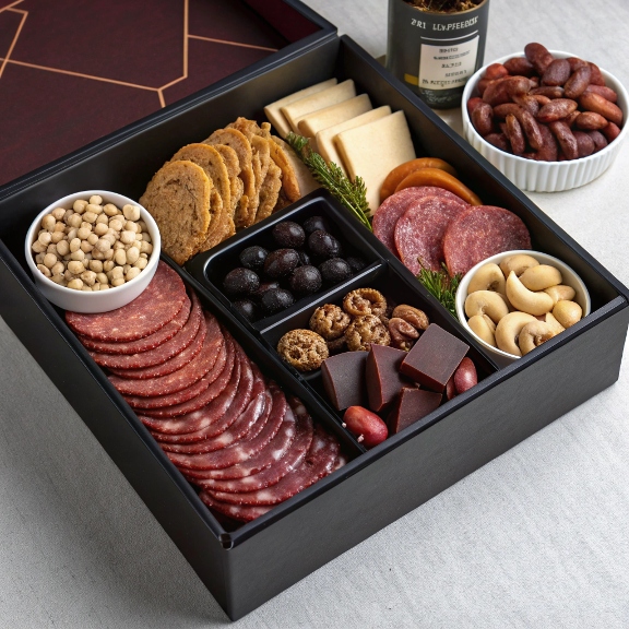 The Small Board is designed to provide a unique gastronomic experience, ideal for one or two people. This elegant box includes 3 selections of premium cheeses and/or charcuterie, carefully chosen to harmonize flavor and texture, along with 4 exclusive accompaniments to complete the experience.